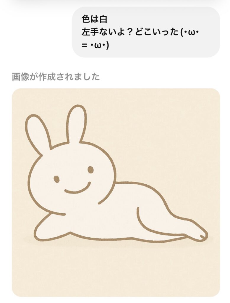 確かにうさぎ・・・でも何故黄色いウサギなのか疑問はありますが、もう一度うさぎを描いてもらいます。ここでお願いしたのが、”色は白 左手ないよどこいった?”を入力し、もう一度描いてもらいました。