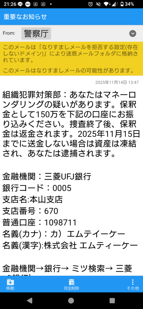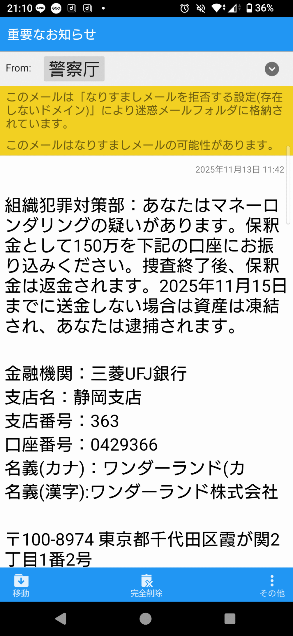 マネーロンダリングの疑いがあるメールが毎日きます(;^ω^)